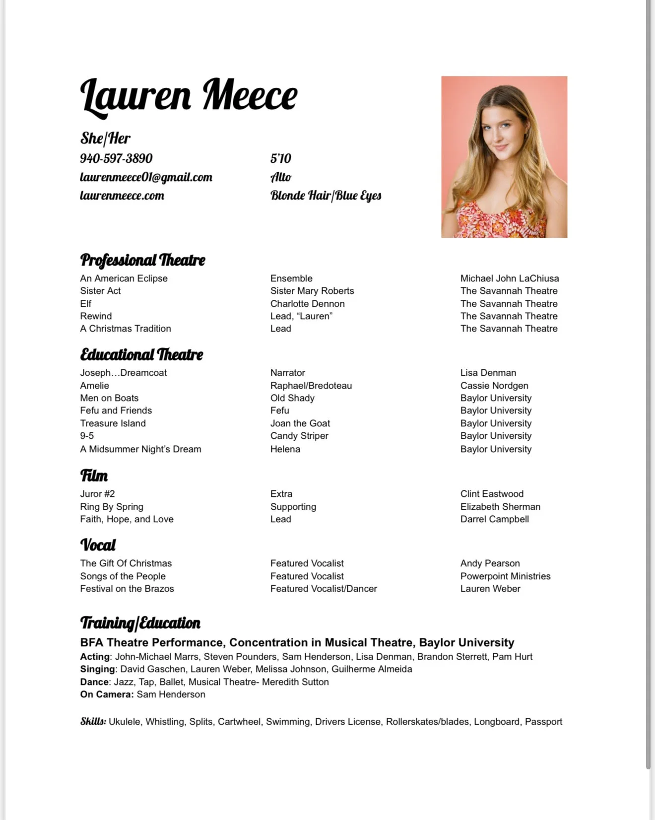 College- Baylor University, BFA Performance/Concentration in Musical Theatre, 2024